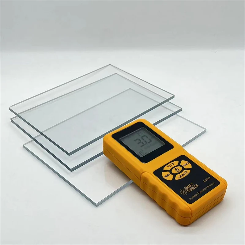 Puikus šviesos pralaidumas: geras šviesos pralaidumas, skaidraus lapo šviesos pralaidumas gali siekti 92%, geras regėjimo suvokimas. Parametrų stabilumas: Antistatinė plokštė gali pasiekti ilgalaikę antistatinę, griežtą techninių parametrų kontrolę, siekiant sumažinti parametrų tolerancijas.